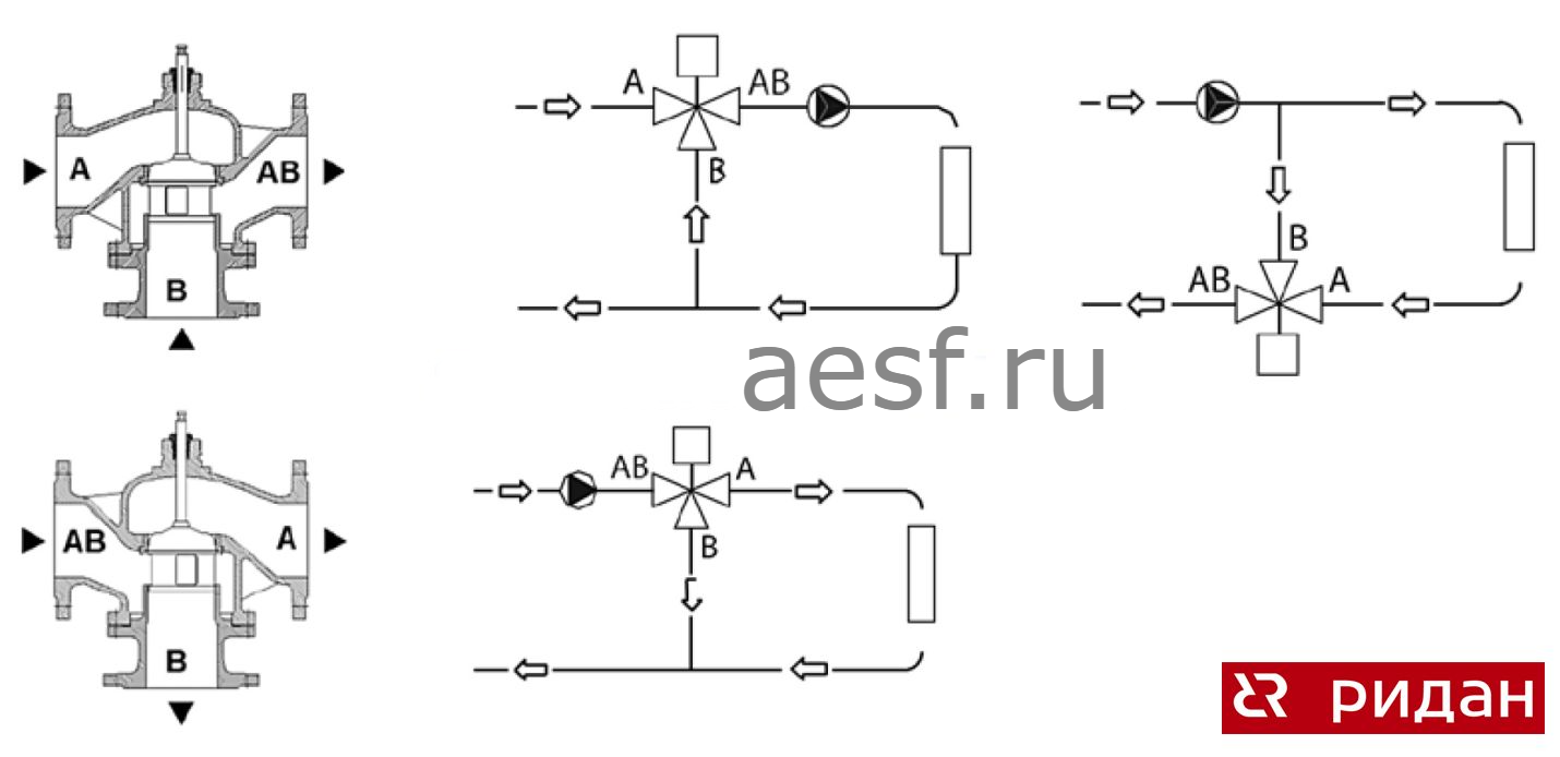 Если трехходовой клапан VF-3R установлен в качестве смесительного клапана, то порты А и В являются входными, а порт АВ — выходным. Такой клапан устанавливается для смешения потоков.